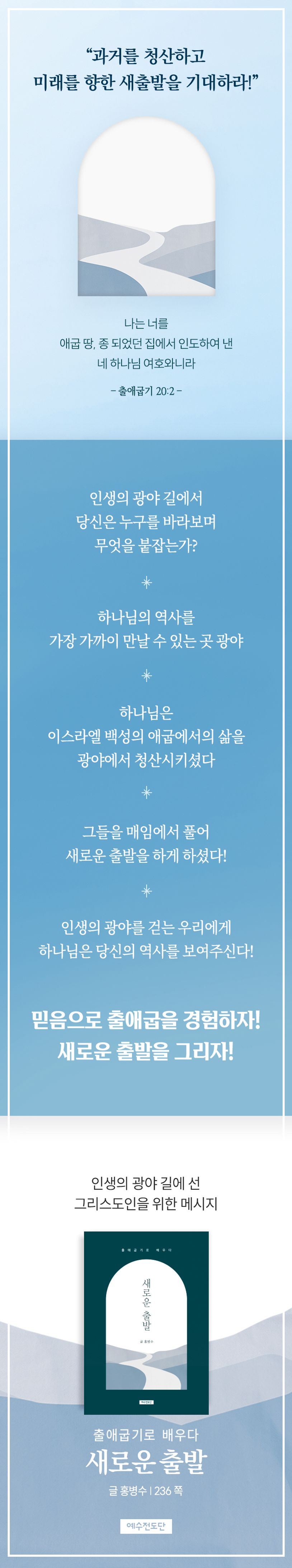 출애굽의 시간 동안 하나님은 이스라엘 백성에게 수많은 이적을 보여주시며 친히 그분의 인도하심을 증명하셨다. 오늘날도 하나님은 끊임없이 우리를 향한 당신의 계획과 역사를 보여주고 계신다. 그것을 보고도 믿지 못하는 것은 우리의 믿음이 부족하기 때문이다. 출애굽의 선한 역사를 경험하길 원하는 마음으로 이 책을 읽는 모든 이에게 풍성히 이뤄질 하나님의 새출발의 은혜와 기적을 기대한다.