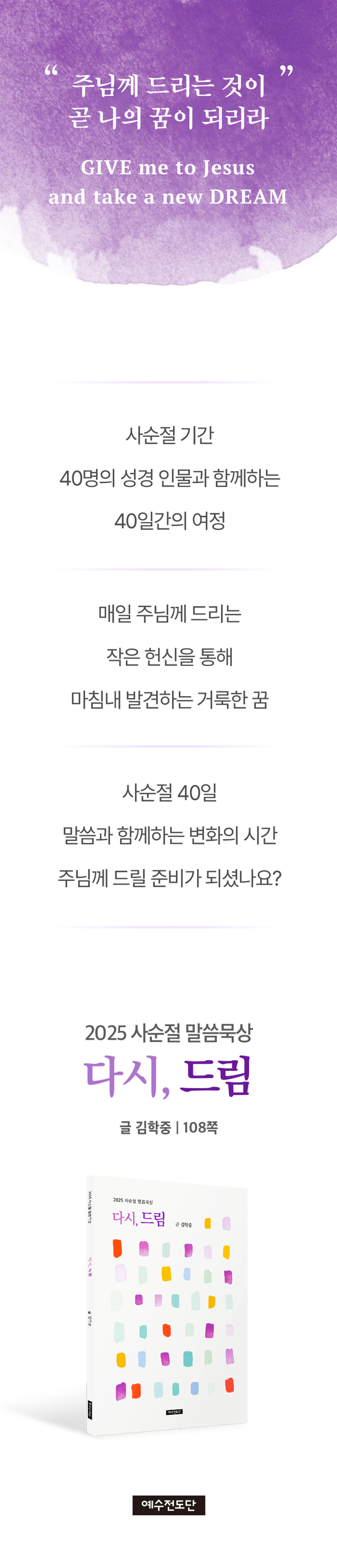 “주님께드리는것이곧나의꿈이되리라”GIVEmetoJesusandtakeanewDREAM2025사순절말씀묵상“다시,드림”2025년의봄이다가오는이때,우리는다시한번거룩한사순절의여정을시작하려합니다.매년찾아오는경건의시간이지만,올해는특별히‘다시드림’이라는깊은묵상의주제를마음에품어봅니다.‘드림(Dream)’과‘드림(Give)’한글의아름다운중의성이담긴이단어는우리가걸어가야할사순절의여정을온전히담아냅니다.우리의모든것을주님께드릴때,그것은새로운꿈이되어우리에게돌아옵니다.마치봄날땅에뿌려진씨앗이죽어새생명이되어돋아나듯,우리의드림은하나님의은혜로더크고아름다운꿈으로피어날것입니다.그래서이번묵상집은‘드림’이라는주제로,40명의성경인물을담아보았습니다.그들은각자의자리에서자신의전부를하나님께드렸습니다.어떤이는자신의재물을,어떤이는자신의시간을,또어떤이는자신의재능을,그리고어떤이는자신의생명까지도드렸습니다.그리고그드림을통해하나님은그들에게상상조차하지못했던꿈을허락하셨습니다.시대가그어느때보다참으로혼란스럽습니다.앞이보이지않는안개속을걷는것같은불안함이우리를짓누릅니다.하지만이럴때일수록우리는다시드려야합니다.우리의불안을드리고,걱정을드리고,시간을드리고,우리의모든것을드려야합니다.그때주님께서우리에게새로운꿈을보여주실것입니다.사순절의40일동안매일한명의성경인물을만나며,그들의‘드림’이어떻게‘꿈’이되었는지를깊이묵상해보십시오.이여정을통해우리모두자신의삶을주님께온전히드리는은혜를경험하게되기를소망합니다.사순절을마치고맞이하는부활절아침,우리는분명달라져있을것입니다.주님께드린우리의작은헌신이거룩한꿈이되어우리안에서자라나있을것입니다.대상독자-깊은묵상으로사순절동안예수님을다시만나고싶은성도-묵상과말씀이주는은혜를담아내며지혜를배우고싶으신분들-사순절묵상을통해예수님이어떤분인지알고싶은초신자