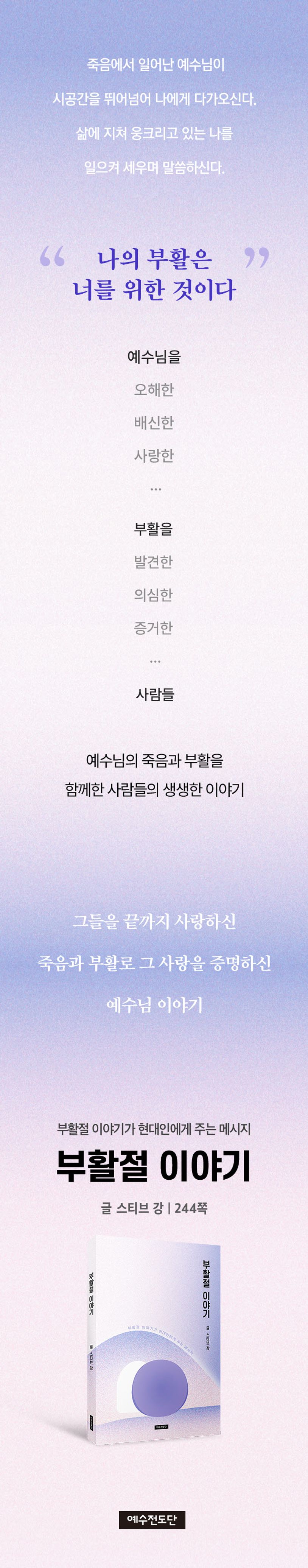 이 책은 예수님의 죽음과 부활을 함께 한 사람들의 이야기다. 예수님을 오해한 사람들, 예수님을 배신한 사람들, 예수님을 끝까지 믿지 못한 사람들, 예수님 때문에 불안했던 사람들, 예수님을 사랑한 사람들, 부활을 발견한 사람들, 부활을 의심한 사람들, 부활을 증거한 사람들의 이야기가 생생하게 그려진다. 그리고 그들을 끝까지 사랑하신, 죽음과 부활을 통해 그 사랑을 증명하신 예수님 이야기가 소개된다.