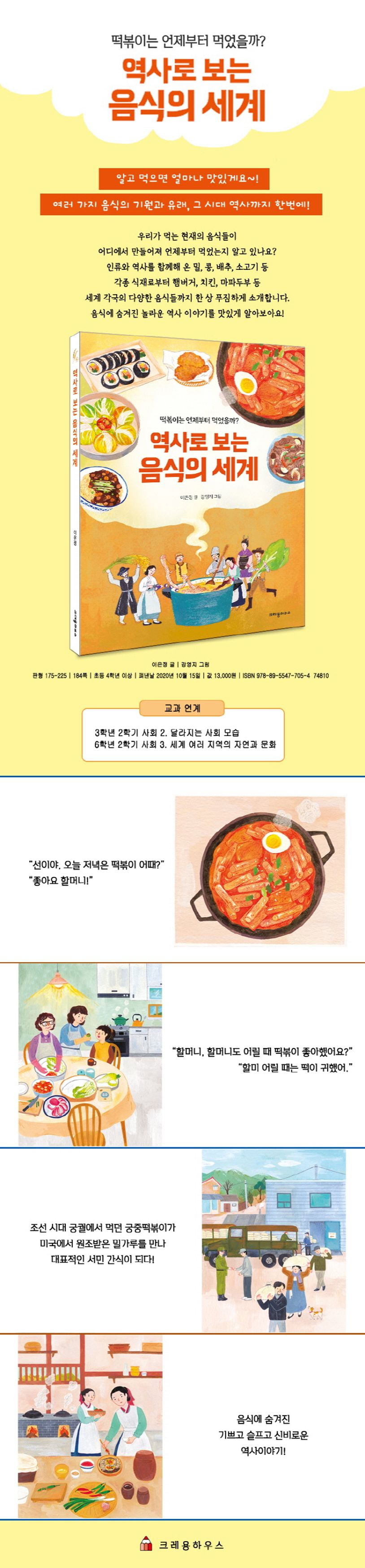 우리가 먹는 현재의 음식들이 어디에서 만들어져 언제부터 먹었는지 알고 있나요? 인류와 역사를 함께해 온 밀, 콩, 배추, 소고기 등 각종 식재료부터 햄버거, 치킨, 마파두부 등 세계 각국의 다양한 음식들까지 한 상 푸짐하게 소개합니다. 음식에 숨겨진 놀라운 역사 이야기를 맛있게 알아보아요!