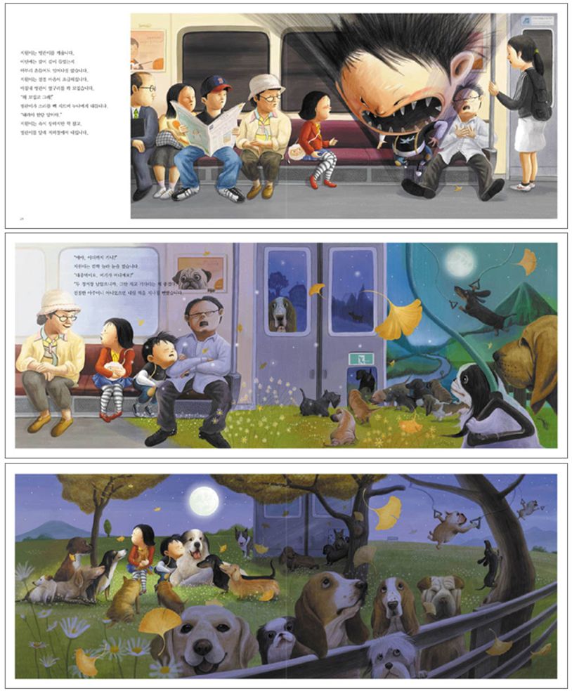 〈font color="dda0dd"〉☞〈/font〉『지하철을 타고서』는 지하철 풍경이 그대로 담겨 있습니다. 음악 듣는 사람, 책을 읽는 사람, 휴대폰을 들여다보는 사람, 입 벌리고 자는 사람, 앞을 보지 못하는 걸인 등이 생생하게 묘사되어 있습니다. 재미있게도 두 남매는 지하철을 타기 전에 만난 강아지들을 꿈 속 지하철에서 만납니다. 지하철 풍경과 어린이다운 상상력을 엿볼 수 있는 그림책입니다.