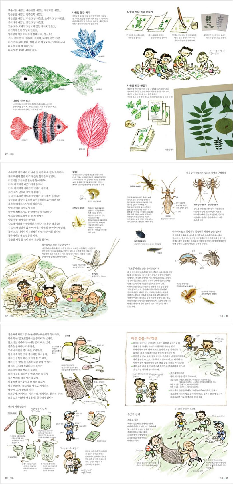 알기 쉽고 재미있는 자연도감『사계절 생태놀이 : 여름』.이 책은 자연물로 즐기는 생태놀이 백과로, 우리 둘레에서 흔히 볼 수 있는 식물과 동물에 대해 궁금한 것들을 자세히 알려준다. 생물의 특징을 잘 보여주는 그림과 사진을 곁들였으며, 철 따라 나뭇잎, 꽃, 열매, 흙, 돌멩이 등의 자연물로 손쉽게 할 수 있는 생태놀이를 가득 담았다. 준비물과 놀이방법을 그림으로 꼼꼼히 그려 놓아 누구나 책을 보고 쉽게 따라 할 수 있다.