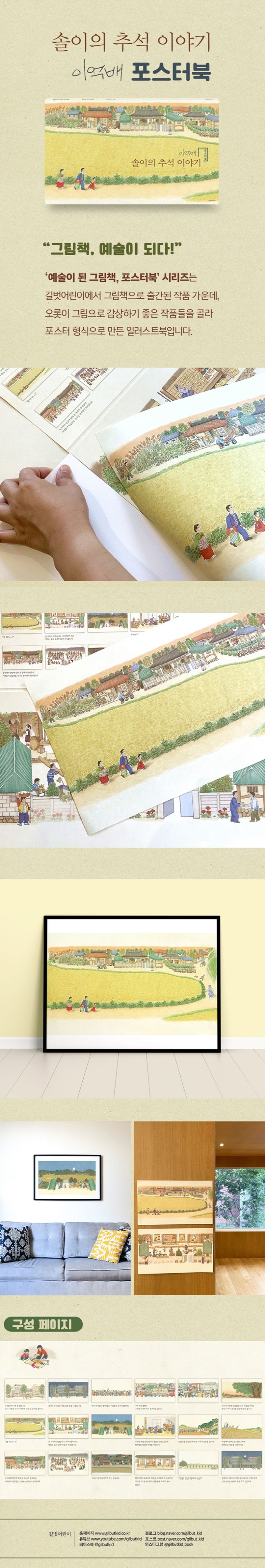 글과 함께 다시 읽고, 마음에 드는 장면은 한 장씩 뜯어 포스터로 사용할 수 있도록 특별 기획하여 제작하였습니다. 고향의 푸근함과 가족의 사랑, 이웃들의 정과 함께 나누는 우리의 아름다운 전통이 담겨 있는 《솔이의 추석 이야기 포스터북》에서 그림책의 감동을 잇는 또 하나의 예술을 만나 보세요!