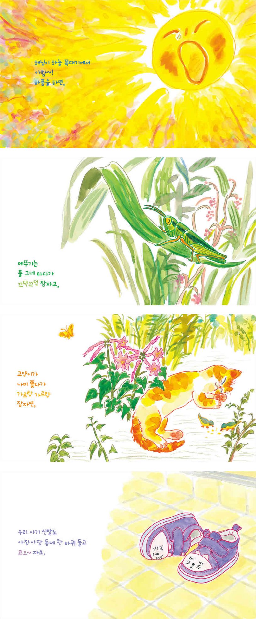 나른한 오후, 하늘 높이 떠 있던 해님이 하품을 해요. “아함~!” 나무 사이로 숨바꼭질 놀이를 하던 다람쥐들도, 혼자서 풀 그네 타던 메뚜기도, 엄마 젖을 먹던 아기 돼지들도 모두 스르르 잠이 들어요. 딸랑딸랑 장난감을 가지고 놀던 아가도 어느새 고개를 꼬박꼬박. “이리 온.” 엄마가 두 팔 벌려 아가를 꼬옥 안아 줘요. 엄마도 아가랑 함께 코~오 잠이 들어요.