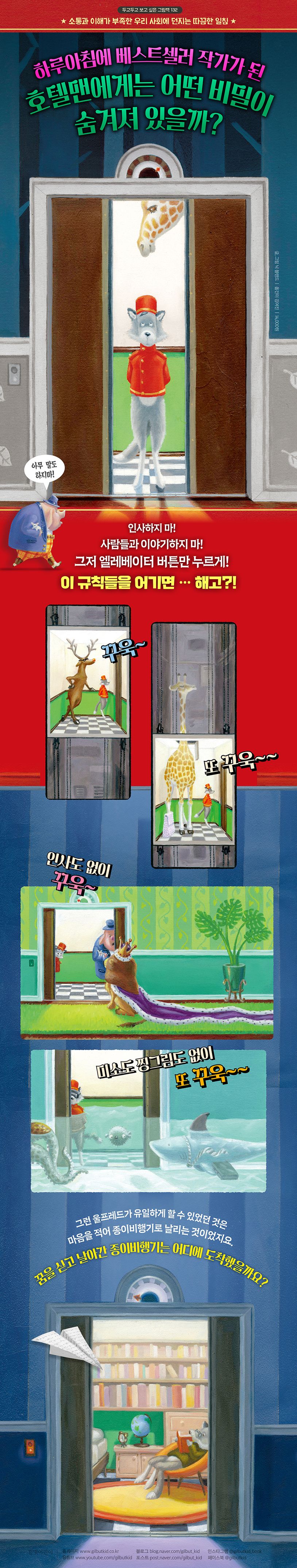 제대로 된 작품을 만들지 못해 '번쩍번쩍 바지 타워 호텔'의 엘리베이터 지기로 일하게 된 늑대 작가 울프레드. 돼지 사장은 울프레드가 지켜야 할 규칙을 알려 줘요. 인사하지 않기, 사람들과 이야기하지 않기, 그저 엘리베이터 버튼만 누르기. 그리고 이 규칙들을 어기면 해고라고 이야기하지요. 울프레드는 낮에는 규칙을 지키며 열심히 일을 하고 일이 끝나면 옥상에 올라가 하루 종일 본 것을 이야기로 써서 비행기로 접어 날렸어요. 어느새 울프레드의 종이비행기는 큰 인기를 끌고, 많은 사람들이 다음 이야기를 기다리게 되었죠. 그러던 어느 날 종이비행기가 잘못 날아가 돼지 사장에게 가게 되고 화가 난 돼지 사장은 규칙을 어겼다며 울프레드를 호텔에서 내쫓아요. 갈 곳도 잘 곳도 없는 울프레드는 어떻게 될까요?