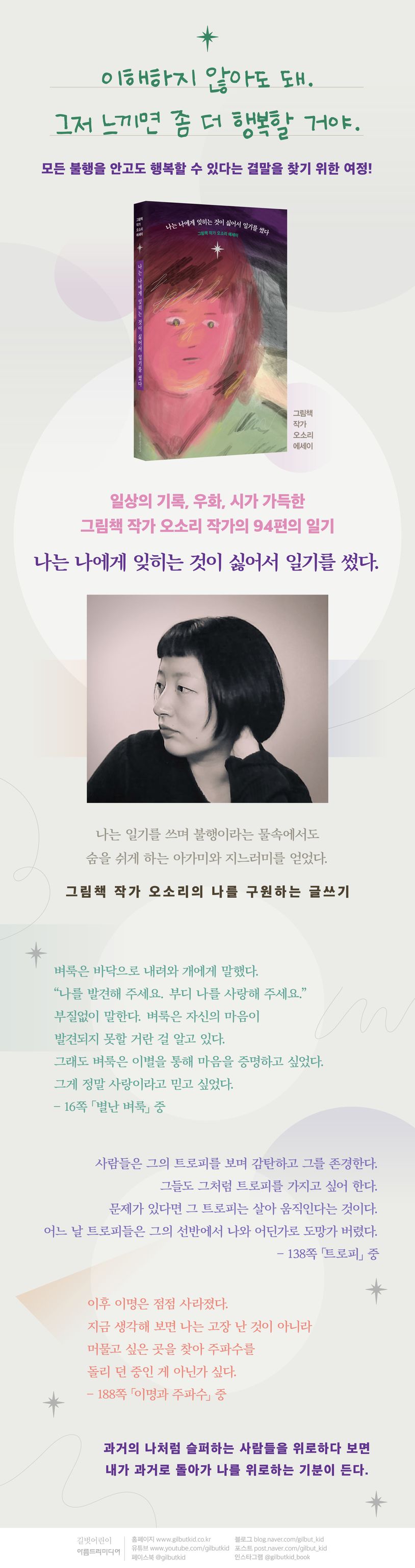 시끄럽게 외치는 내면의 목소리를 더 이상 외면할 수 없을 때 우리는 일기를 씁니다. 일기를 쓰고 시간이 흘러 다시 펼쳐보면 때론 그때의 감정이 낯설게 느껴지기도 하고, 지금과 크게 다르지 않은 비슷한 감정과 생각의 흔적들을 발견하기도 하지요. 오소리 작가는 절대 변하지 않을 어린 시절의 기억과 아픔, 하루를 지내며 곁을 떠나지 않았던 생각과 경험의 잔상들을 잊지 않기 위해 오랜 시간 글로 기록해 왔습니다.