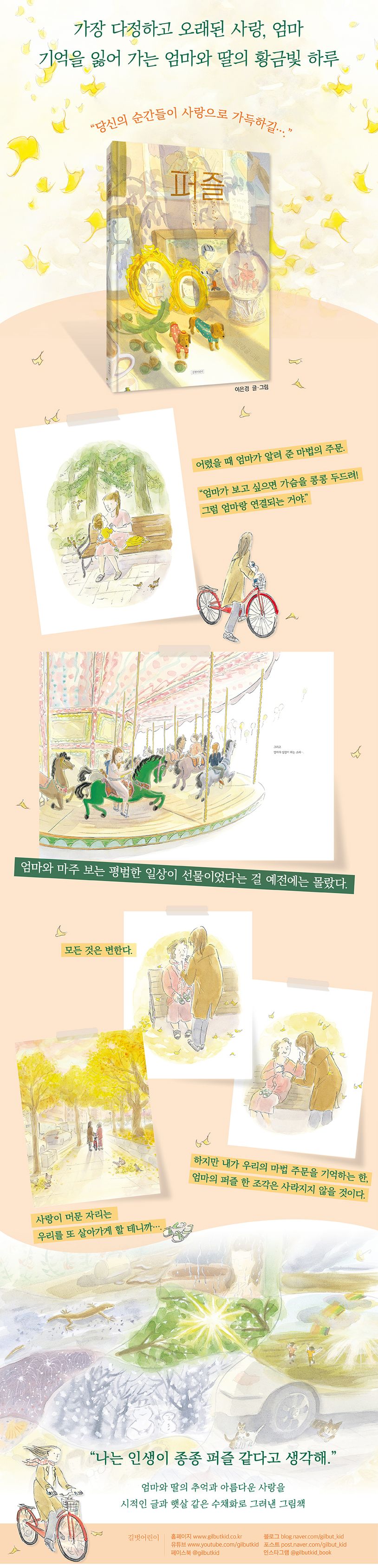 엄마의 기억은 퍼즐 같습니다. 조각이 하나둘 떨어져 나간 것처럼 엄마의 기억에 빈자리가 조금씩 늘어 갑니다. 그런 엄마를 만나러 집으로 가는 기차에서 우연히 아이들을 보게 되고, 어렸을 적 기억이 떠오릅니다. 저만한 나이일 때 엄마와 만든 특별한 추억이 있거든요. 예전에 엄마는 떨어지기 싫어하는 나에게 ‘마법의 주문’을 걸어 주곤 했습니다. 아무리 멀리 있어도, 가슴을 콩콩 두드리면 엄마랑 연결된다고 말하면서요. 엄마의 사랑이면 무서울 게 없던 시절들, 그때를 생각하니 마음이 아려옵니다. 기억을 조금씩 잃어 가는 엄마가 언젠가 나를 잊으면 어떻게 해야 할까요. 사랑으로 가득한 기억 조각마저 사라지면요….