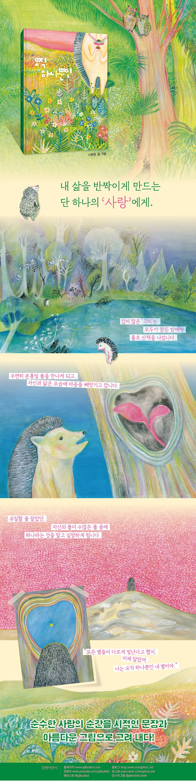 이렇듯 《오직 하나뿐인》은 가시 속에 숨어 홀로 외롭게 지내던 고슴도치, ‘고치’가 작은 풀을 만나면서 느끼게 되는 가슴 설렘과 특별한 ‘사랑’의 감정을 담았습니다. 이전 작품들에서 태어남에서 죽음까지 철학적인 질문을 던져 온 나현정 작가는 이번에 고치와 풀의 이야기로 ‘사랑이란 무엇일까?’에 대한 질문을 던집니다. 서로 같으면서도 다른 세상에서 살아온 두 존재가 자신의 마음의 문을 열고, 상대에게 의지하고, 상대의 특별함을 느끼게 되는 순간을, 나현정 작가 특유의 진솔한 글과 봄처럼 화사한 그림으로 담아냈습니다. 읽고 나면 다정한 내 사람이 떠오르는 그림책, 《오직 하나뿐인》을 만나 보세요.