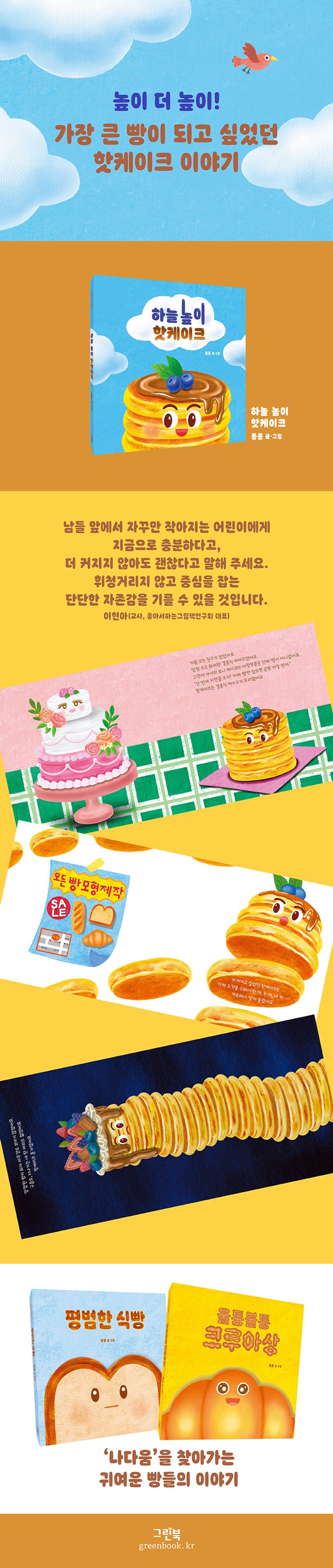 귀여운 빵 이야기 《평범한 식빵》과 《울퉁불퉁 크루아상》으로 독자들의 시선을 사로잡은 종종 작가의 세 번째 ‘빵 그림책’이 새로 나왔습니다. 이번엔 어린이들이 간식으로 즐겨 먹는 핫케이크가 그 주인공으로, 제목은 《하늘 높이 핫케이크》입니다. 《평범한 식빵》이 평범함에 대한 고민과 색다른 해석을 담았다면, 《울