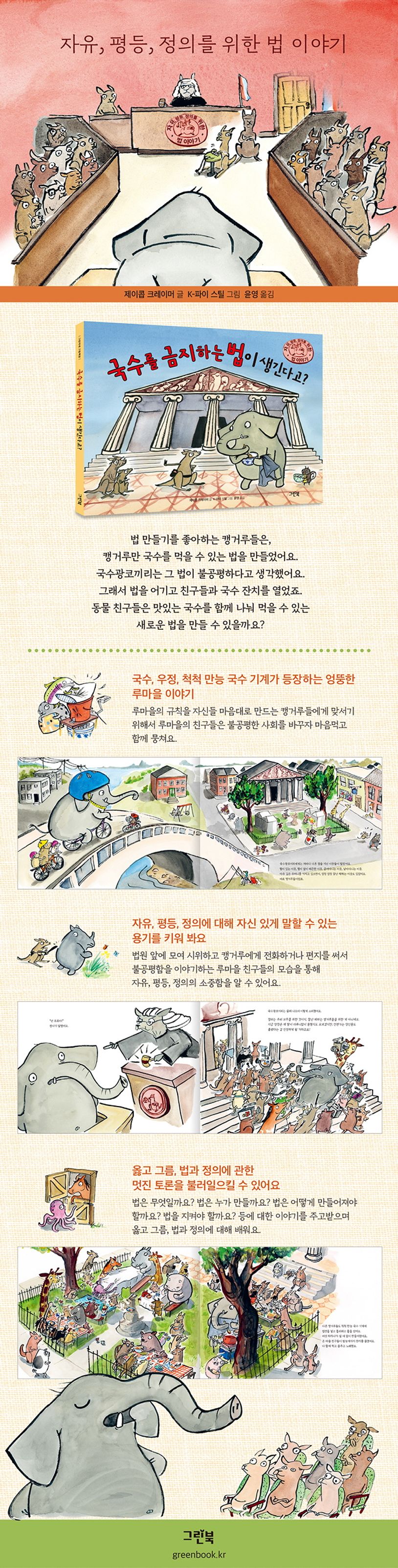 국수 잔치를 좋아하는 국수광코끼리는 자신들을 위한 법만 만드는 캥거루 때문에 혼란스러웠어요. 캥거루만 국수를 먹을 수 있다는 법을 정했거든요. 국수광코끼리는 그 법이 불공평하다고 생각했어요. 그래서 큰 결심을 하고 친구들과 함께 척척 만능 국수 기계를 만들어요. 펜을 펜네로, 베개를 수제비로, 스프링을 마카로니로 만드는 기계를 말이죠. 그렇게 국수 잔치가 다시 열렸어요. 그런데 캥거루들이 국수 잔치를 방해하러 찾아와요. 과연 루마을의 친구들은 캥거루의 방해를 물리치고 국수 잔치를 열 수 있을까요?