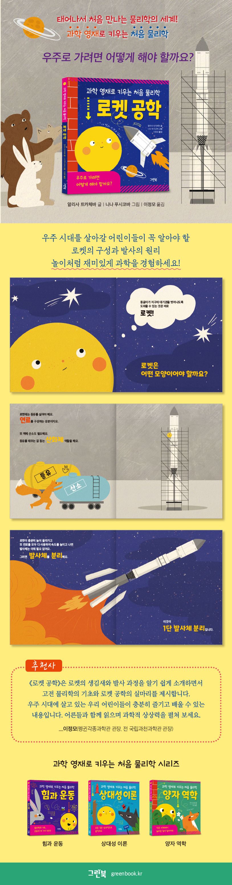 과학 그림책 ‘과학 영재로 키우는 처음 물리학’ 시리즈(전 4권)가 새로 나왔습니다. 이 시리즈는 6~9세, 즉 유아 및 예비 초등학생 아이들을 대상으로, 모든 과학적 현상의 근본이라고 할 수 있는 물리학의 세계를 소개합니다. 힘과 운동의 법칙을 담은 뉴턴의 고전 물리학에서 시작하여 우주 시대에 주목받는 로켓 공학, 그리고 현대 물리학의 양대 산맥인 상대성 이론과 양자 역학까지 6~9세 연령의 독자들에게 소개하는 것이 과연 가능할까요? 언뜻 생각하면 불가능해 보이지만, 책을 펼쳐 보면 각 개념의 기본과 핵심을 어린이들에게 맛보이기 위해 세심하게 공들인 기획이라는 걸 알 수 있습니다.