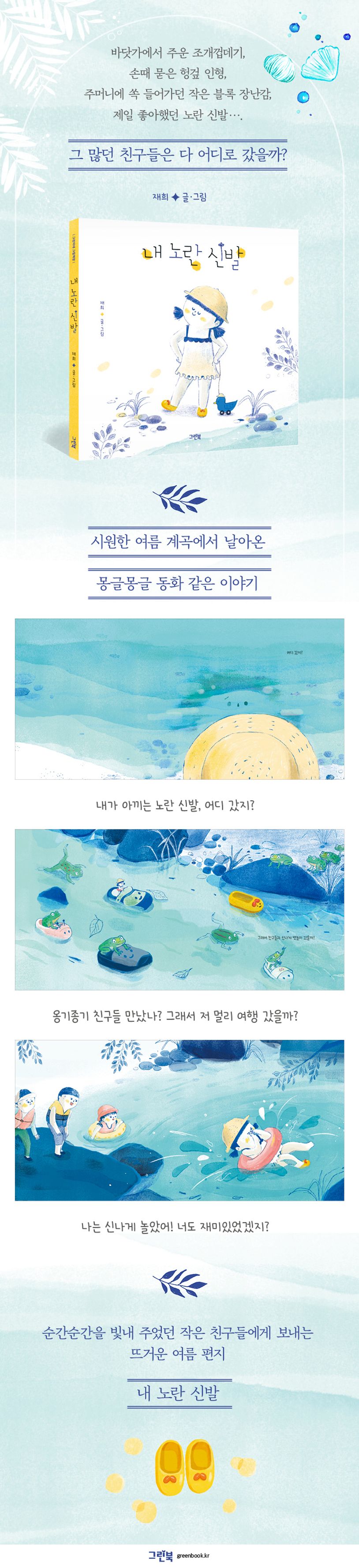 다채로운 주제와 개성 있는 그림으로 읽는 감동과 보는 즐거움을 선사해 온 그린북에서 새 그림책이 출간되었습니다. 바로 재희 작가의 《내 노란 신발》입니다. 재희 작가 하면 떠오르는 시원하고 청량한 파란 색감을 이번 책에서도 유감없이 만날 수 있을 뿐 아니라 전보다 더 다채로운 색상으로 포인트를 준 아름다운 그림으로 독자들을 찾아갈 예정입니다.