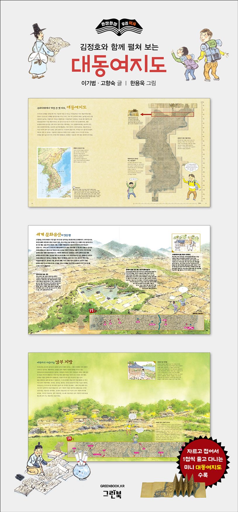 대동여지도는 한평생을 지도 연구에 몸 바친 김정호의 열정이 담겨 있는 우리의 훌륭한 문화유산이에요. 대동여지도를 한 첩 한 첩 넘기다 보면 우리 땅에 흥미를 갖게 되고 어느새 우리나라를 사랑하게 될 거예요. 그럼 지금부터 우리나라의 아름다운 산과 강, 잘 정리된 마을과 길, 그리고 그곳에 담겨 있는 사람들의 이야기를 찾아 여행을 떠나 볼까요?