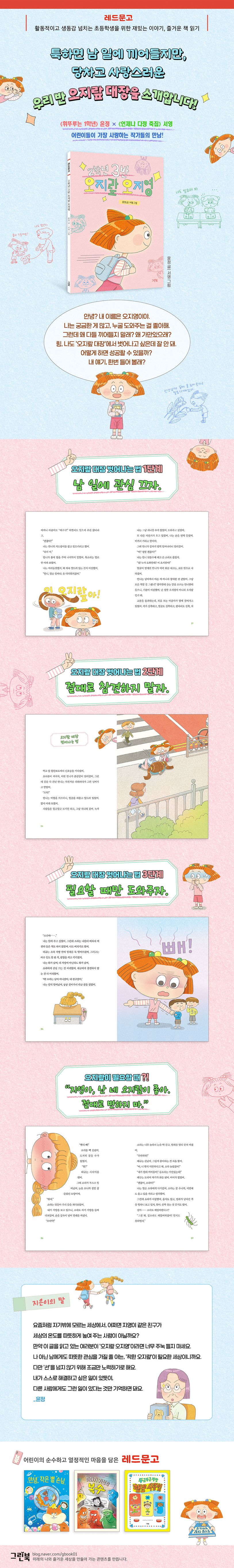 초등학생을 위한 재밌는 이야기, 즐거운 책 읽기 시리즈, 레드문고의 신간 《2학년 3반 오지랖 오지영》이 출간되었습니다. 이 책은 친구와 주변에 대한 호기심과 관심이 많아서 일명 ‘오지랖 대장’이라고 불리는 2학년 지영이의 일상과 고민을 담은, 따뜻하고 깊은 공감을 자아내는 동화입니다.
