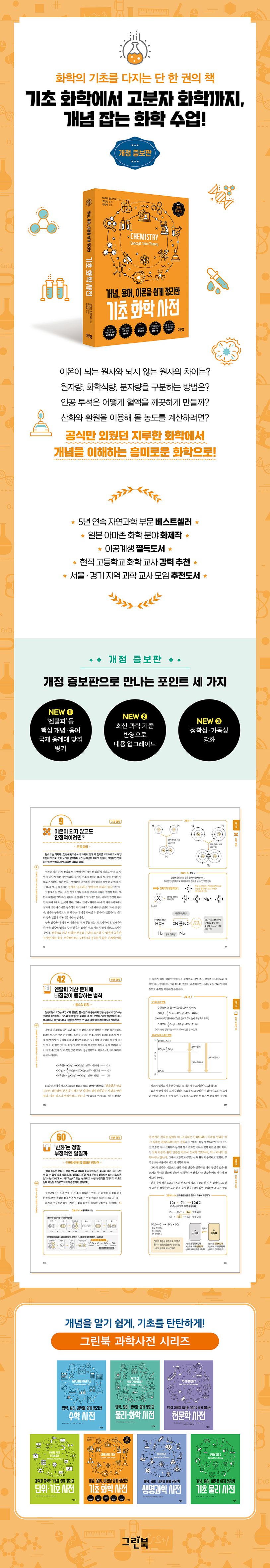 화학의 기본 개념을 한 권으로 알차게 정리한 《개념, 용어, 이론을 쉽게 정리한 기초 화학 사전》의 개정 증보판이 최신 개념•용어 반영과 정확성을 더해 그린북에서 출간되었다. 2020년에 처음 선보인 《기초 화학 사전》은 그린북 ‘과학 사전’ 시리즈의 다섯 번째 책으로, 이 시리즈는 물리, 화학, 천문학, 수학 등 자연과학 각 분야의 기본 원리를 한 권으로 정리하여 청소년, 전공자, 과학 애호가들에게 좋은 반응을 얻고 있다.