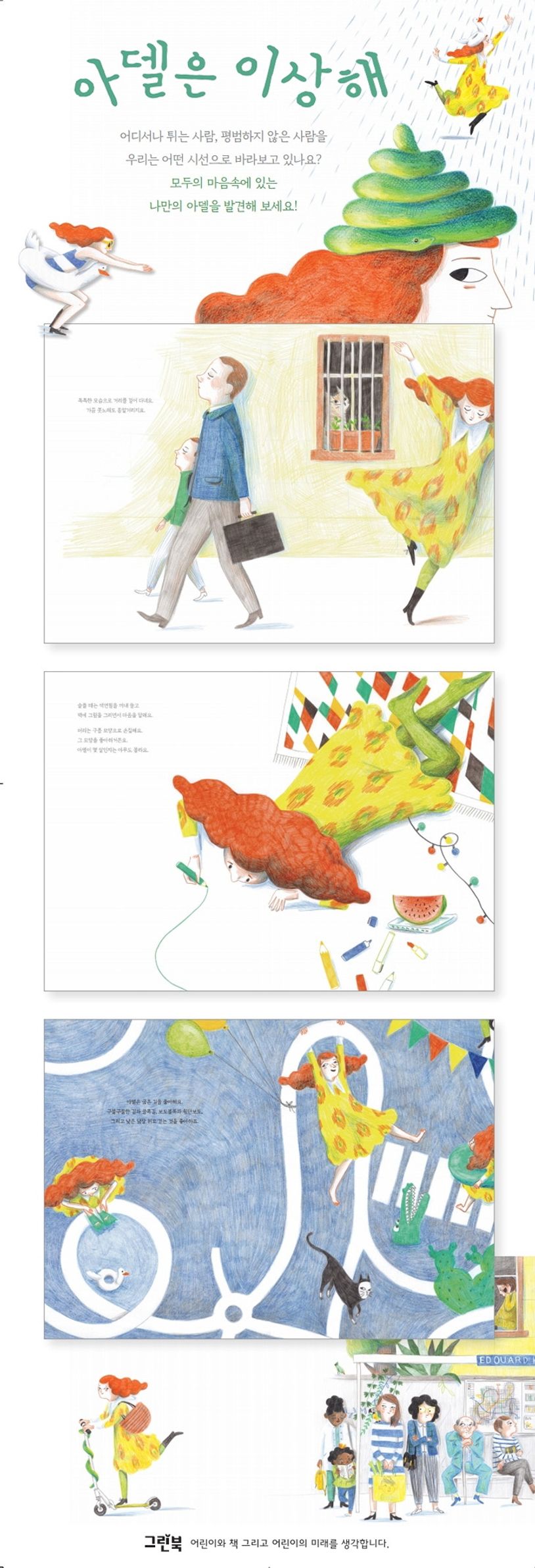 아이와 이 책을 함께 읽고 나 자신 또는 우리 가족 구성원, 이웃 사람들의 독특한 개성을 하나하나 찾아보는 것은 어떨까요? 그린북 신간 그림책 《아델은 이상해》를 통해 모두가 자기만의 개성을, 양보하고 싶지 않은 똥고집을, 버리고 싶지 않은 고약한 버릇을, 무엇과도 바