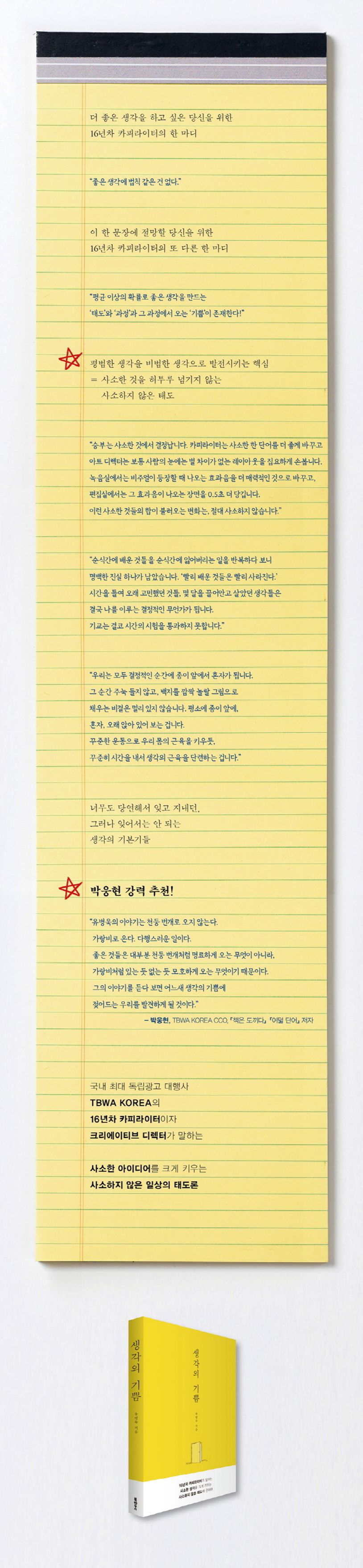 책의 제목이기도 한 ‘생각의 기쁨’은 번듯한 결과물로부터 오는 것이 아니라, 작은 아이디어의 씨앗을 그럴 듯한 무언가로 만들어가는 과정에서 비로소 찾을 수 있다고 말하며 대표적인 크리에이터들의 집단으로 손꼽히는 광고업계의 현장감 풍부한 이야기와 함께 카피라이터의 예민한 촉수를 건드리며 좋은 생각을 만드는 태도에 대한 화두를 던졌던, 그리하여 한 번쯤 눈길을 주어 들여다봄직한 콘텐츠와 귀를 기울여 들어봄직한 일상의 경험들을 조곤조곤한 목소리로 들려준다.