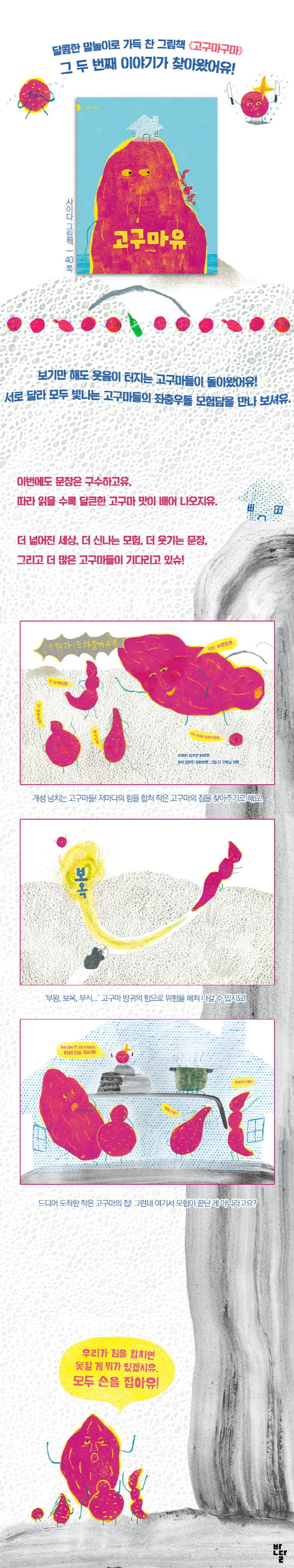 동글동글 조그마한 고구마 친구가 집을 잃어버려 울고 있어요. 어려움에 처한 친구를 봤으니 가만히 있을 수 없죠! 고구마 친구들이 두 팔 걷어붙이고 도와주기로 했어요. 가파른 오르막도, 위험천만한 구멍도, 깊은 강도, 절벽도 모두 문제없어요. 고구마 친구들이 힘을 합치면 못할 일이 없거든요. 부왕! 보옥! 보로로! 방귀 부스터를 켜고 멀고 험한 길을 함께 걸어 드디어 친구의 집에 도착했어요. 지치고 피곤한 고구마 친구들에게 조그마한 고구마가 무언가 이야기합니다. 깜짝 놀랄 오해는 있었지만, 따뜻한 고구마 죽을 먹으니 긴 여정에 지친 마음이 사르르 풀려요.