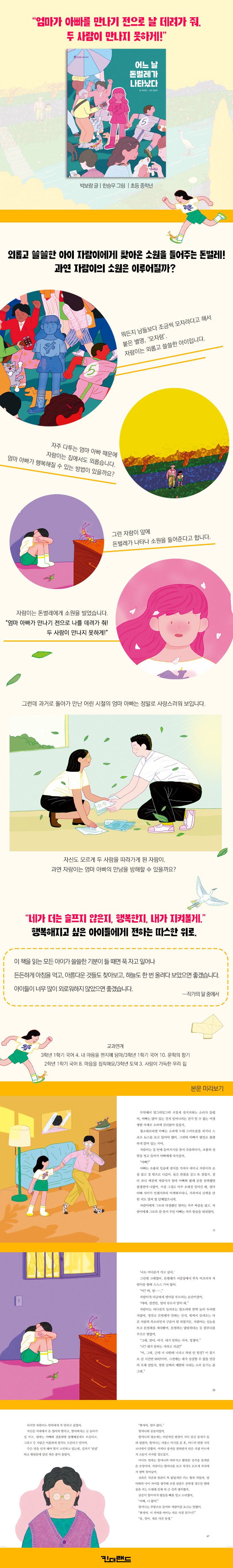 자람이 엄마와 아빠는 자주 싸웁니다. 어느 날, 아빠는 자람이에게 엄마와 헤어지면 어떨 것 같은지 물어봅니다. 서로 좋아하고 행복해서 결혼했을 텐데, 언제부터인가 엄마와 아빠는 서로를 보면 한숨만 짓습니다. 자람이 역시 마음이 불편합니다. 새로 이사한 집에 웅크리고 앉아 있는 자람이 앞에 돈벌레가 나타나 말합니다. 소원 세 가지를 들어주겠다고요. 자람이는 첫 번째 소원으로 엄마와 아빠가 만나기 전으로 데려가 달라고 합니다. 어쩌면 그곳에서 모두가 불행하지 않을 방법을 찾을 수 있을지 모르니까요. 하지만 자람이가 도착했을 때에는 이미 두 사람이 만나고 난 뒤였습니다. 엄마 아빠의 어린 시절로 돌아간 자람이, 그곳에서 자람이는 소원을 이룰 수 있을까요? 자람이가 진짜 바라는 소원은 무엇일까요?