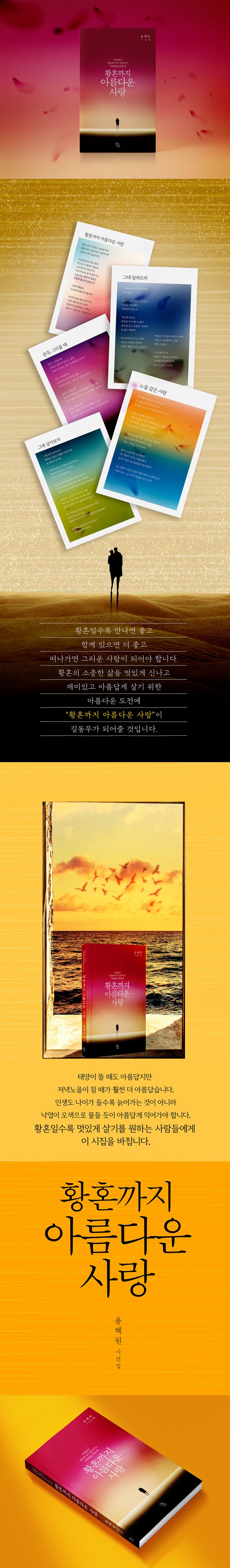 책이있는마을에서는 그동안 용혜원 시인의 시 중에서 황혼을 아름답고 멋있게 가꾸어갈 나침반이 되어줄 시들을 모아 〈황혼까지 아름다운 사랑〉의 꽃다발을 꾸몄다. 태양이 뜰 때도 아름답지만 저녁노을이 질 때가 훨씬 더 아름답듯 인생도 나이가 들수록 늙어가는 것이 아니라 낙엽이 오색으로 물들 듯이 아름답게 익어가야 한다. 황혼일수록 멋있게 살기를 원하는 사람들에게 용혜원 시집 “황혼까지 아름다운 사랑”은 인생을 너그럽고 평화로운 길로 안내해 줄 것이다.