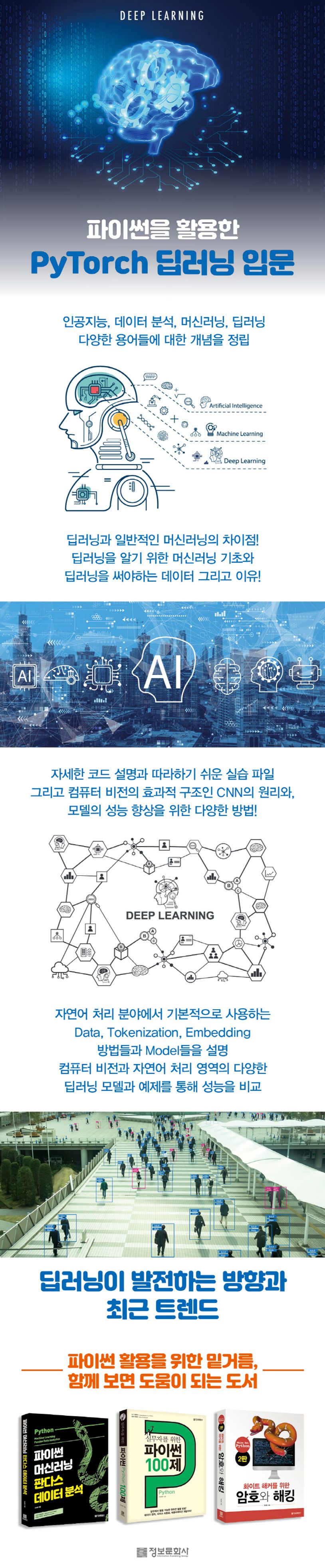 파이토치를시작하기위한밑거름!딥러닝은만능이며이미지관련Task에는CNN,텍스트관련Task에는RNN을사용하면된다고많은사람들이알고있다.딥러닝은이미지나텍스트에비해높은성능을지니고있는것은맞지만,중요한것은왜딥러닝이이미지나텍스트에잘맞는지를이해하는것이다.딥러닝은새로운모델의개념이아닌,신경망이발전한모델이므로학습하는알고리즘의특성상과적합이심하게일어난다.이책은파이썬으로딥러닝을이해하고자하는사람들을위해그분야를중점적으로친절하게설명하고있다.세명의저자가인공지능을공부하면서궁금했던부분을재정립하고,꼭알아야할내용만집중적으로정리하였기때문에입문자에게적합한도서이다.평생프로그래밍을할일이없다고생각하던‘코알못’들도그과정을직접겪은저자가기초부터설명하기때문에어떻게공부해야하는지를알수있을것이다.