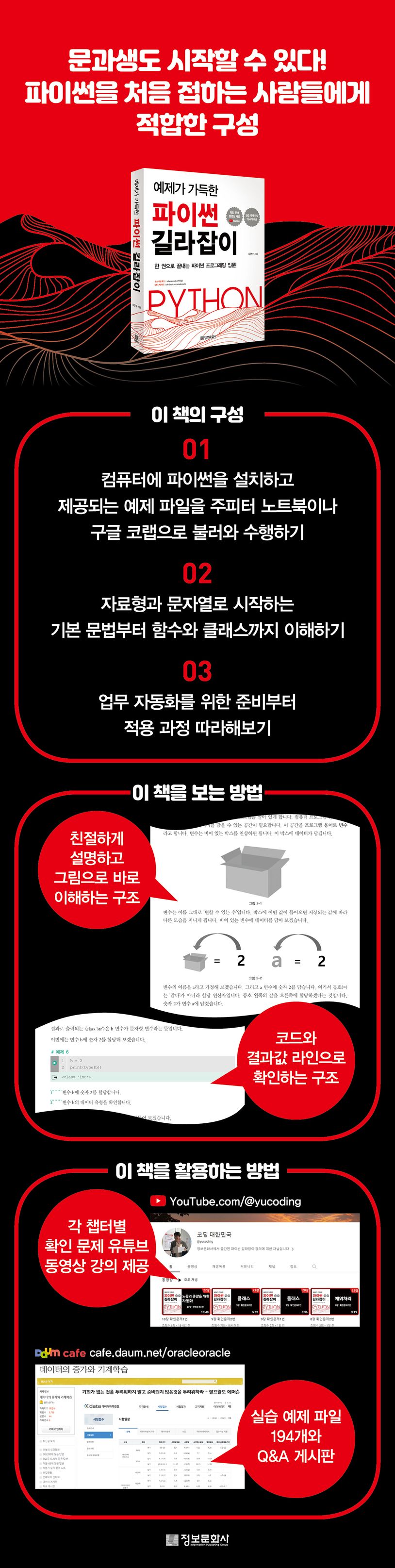이 책은 파이썬을 처음 시작하는 사람들에게 방향을 바로잡아 나아갈 수 있는 길라잡이 역할을 할 것이다. 내 컴퓨터에 설치하는 방법을 화면 캡처를 통해 순서대로 자세하게 알려주며, 처음부터 코드를 입력하며 어렵게 느껴지지 않도록 예제 파일을 제공하기 때문에 다운로드 받아 직접 실행해 볼 수 있다. 특히 파이썬의 시작이라고 할 수 있는 문법은 문과생도 이해할 수 있도록 그림으로 예로 들어 친절하게 설명하고 있으며, 예제 소스별 라인의 설명과 결과값을 한눈에 볼 수 있도록 구성하였다. 그리고 다양한 예제를 추가적으로 보여주는 확인 문제들은 저자가 유튜브를 통해 동영상 강좌를 제공하기 때문에 좀 더 상세한 설명을 들을 수 있고 궁금한 사항은 피드백도 가능하다. 다년간 실무에서 코딩 교육을 진행하고 있는 저자가 노하우를 녹여놓은 책이기 때문에 초보자가 쉽게 놓치는 부분과 꼭 알고 넘어가야 할 부분들을 꼼꼼하게 챙겨놓았으니 믿고 시작해도 좋을 것이다.