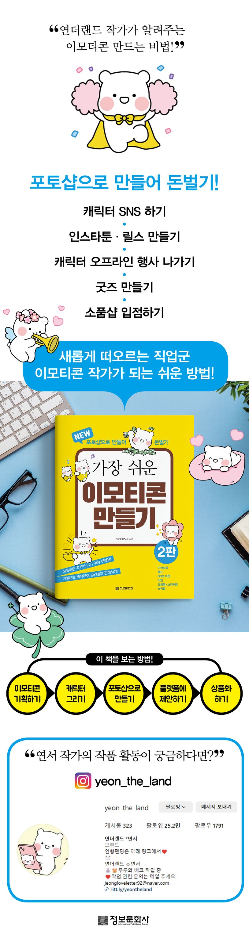 그동안 100개 넘는 이모티콘을 출시한 ‘연서’ 작가가 새로운 직업군으로 주목받는 이모티콘 작가의 세계를 면밀히 보여주면서 시작하는 이 책은 이모티콘을 처음 만들고자 하는 사람들이 쉽게 따라 할 수 있도록 어떻게 기획하는지부터 보여준다. 다양한 플랫폼과 다양한 이모티콘 스타일들을 소개하여 본인이 원하는 타깃을 정하고, 캐릭터를 그리기 위해 이름 짓고 스케치하는 과정을 직접 연습해 볼 수 있다. 특히 포토샵으로 이모티콘을 만들기 위한 과정인 파일 형식, 자주 사용하는 기능들만 모아 소개, 그려서 채색하고, 움직이는 캐릭터까지 만들어 볼 수 있다. 카카오톡과 밴드 외에도 다양해진 플랫폼에 제안하는 승인 과정을 안내하기 때문에 본인의 성향에 맞는 곳을 선택할 수 있다. 저자가 지금의 자리까지 오기 위해 겪었던 실패와 도전, 고난과 역경을 보여줌으로써 용기를 얻을 수 있고, 그 영양분을 발판 삼아 누구든 도전해 볼 수 있다. 특히 캐릭터를 만드는 것에 그치지 않고 수익 창출을 위한 다양한 방법들을 안내하기 때문에 ‘포토샵으로 만들어 돈 벌기’에 제격인 책이다.