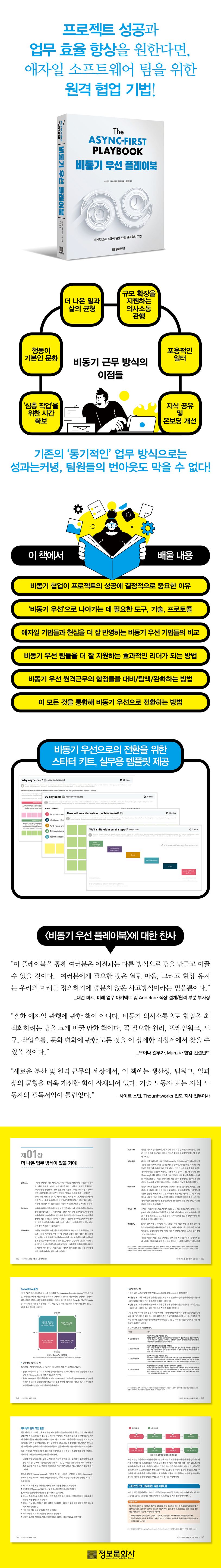 이 책은 효과적인 비동기 업무 관행들의 여러 이점과 난제들을 면밀히 검토하며, 비동기 우선 접근 방식으로의 전환을 시작하기 전에 알아 두어야 할 근본적인 사항들을 논의한다. 현업에서 사용 가능한 각종 실무자 가이드뿐만 아니라, 비동기 우선 업무 방식을 지지하는 리더로서 비동기적인 사고방식을 여러분의 관리 스타일에 적용하는 방법도 설명한다. 또한 그다음 단계들을 결정하는 데 도움이 되는 스타터 키트와 실무용 템플릿을 제공해, 한층 수월하게 비동기 우선 업무로 나아갈 수 있게 한다.