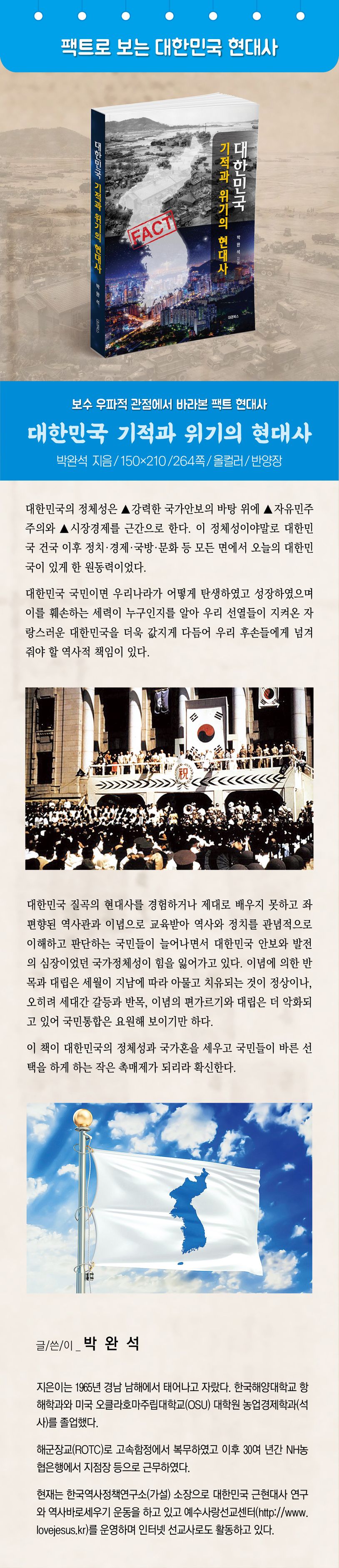 보수우파적관점에서기술한대한민국현대사필자는정치와역사에관심이많고평소대한민국국민으로서자랑스러움과긍지그리고대한민국을건국하고지켜온분들에대한고마움을갖고살고있는평범한시민이다.최근대한민국의정치,경제,사회가진행되어가는과정을보면서선열들의피와땀으로지켜온자유대한민국이잘못된방향으로가고있음을직감하고마치임진왜란때의병의심정으로,6·25전쟁때학도병의심정으로펜을들고역사바로세우기에나섰다.바둑기사보다훈수꾼이수를더멀리보는것처럼특정정당이나정파또는노조에속한정치인이나언론인보다는때론역사에관심이많고다양한역사를경험하고보아온일반시민의눈이더객관적이고정확할수있을것이다.정치인을선택하는것은국민이며국민이깨어있어야바른선택을할수있다.깨어있다는것은바른역사관과국가정체성(국가혼)을갖는것을의미한다.대한민국질곡의현대사를경험하거나제대로배우지못하고좌편향된역사관과이념으로교육받아역사와정치를관념적으로이해하고판단하는국민들이늘어나면서대한민국안보와발전의심장이었던국가정체성이힘을잃어가고있다.이념에의한반목과대립은세월이지남에따라아물고치유되는것이정상이나,오히려세대간갈등과반목,이념의편가르기와대립은더악화되고있어국민통합은요원해보이기만하다.대한민국국민들사이에드리워진반목과대립의먹구름을걷어내고국민통합을이루어더밝은내일을기약하고우리후손들에게자랑스러운대한민국을물려주기위해서는국민모두가올바른역사관과국가정체성으로재무장하는것이급선무이다.대한민국의정체성은▲ 강력한국가안보의바탕위에▲ 자유민주주의와▲ 시장경제를근간으로한다.이정체성이야말로대한민국건국이후정치·경제·국방·문화등모든면에서오늘의대한민국이있게한원동력이었다.대한민국국민이면우리나라가어떻게탄생하였고성장하였으며이를훼손하는세력이누구인지를알아우리선열들이지켜온자랑스러운대한민국을더욱값지게다듬어우리후손들에게넘겨줘야할역사적책임이있다.이책이대한민국의정체성과국가혼을세우고국민들이바른선택을하게하는작은촉매제가되리라확신한다.