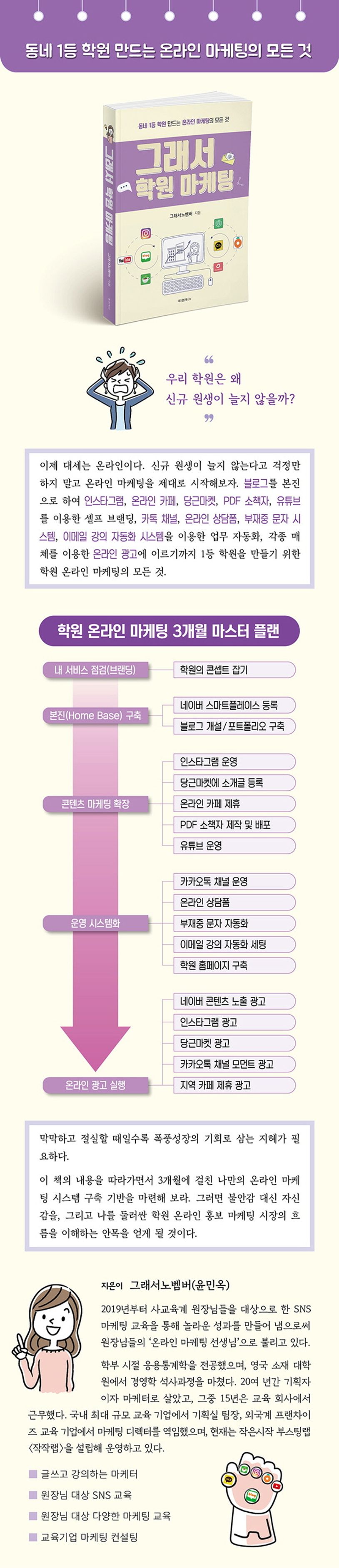 이제 대세는 온라인이다. 신규 원생이 늘지 않는다고 걱정만 하지 말고 온라인 마케팅을 제대로 시작해보자. 블로그를 본진으로 하여 인스타그램, 온라인 카페, 당근마켓, PDF 소책자, 유튜브, 카톡 채널, 온라인 상담폼, 부재중 문자 시스템, 이메일 강의 자동화 시스템을 이용한 업무 자동화, 각종 매체를 이용한 온라인 광고에 이르기까지 1등 학원을 만들기 위한 학원 온라인 마케팅의 모든 것.