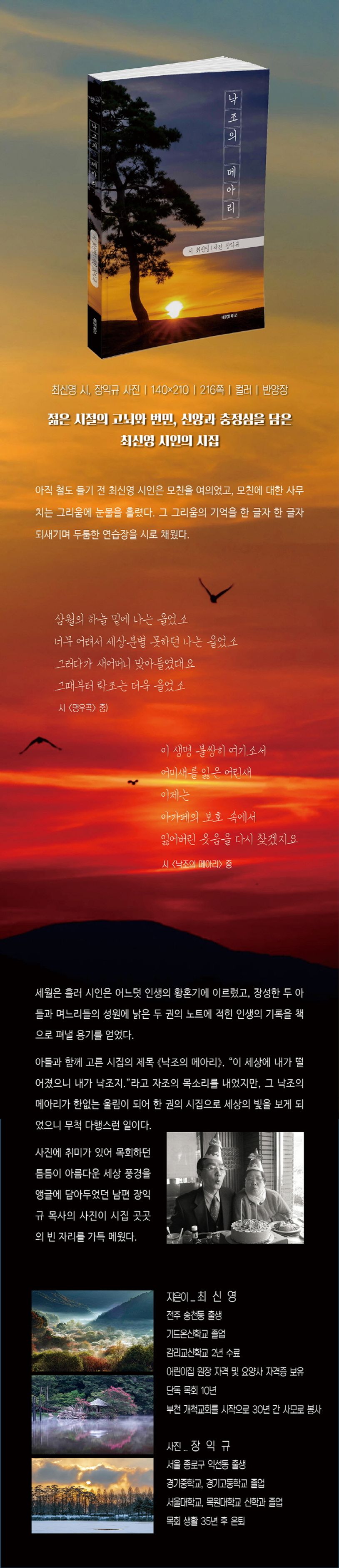 젊은 시절의 고뇌와 번민, 신앙과 충정심을 담은 최신영의 시집. 모친을 일찍 여의고 그 그리움을 가슴 속에 묻고 살아야 했던 어린 나날들, 신앙을 가지고 목회활동과 나라를 위한 애국활동에 매진했던 젊은 날의 열정을 담은 최신영 시인의 시들이, 남편인 장익규 작가의 사진과 함께 시집으로 엮어져 나왔다.