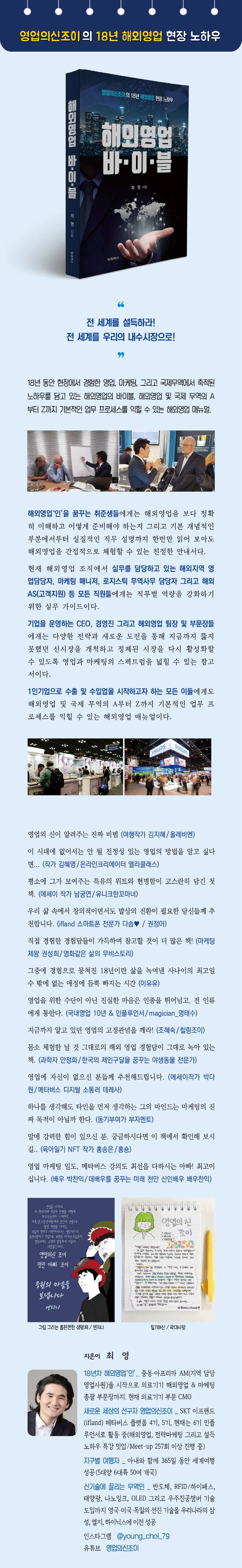 전세계를설득하라!전세계를우리의내수시장으로!대한민국은수출의존국가다.우리나라는개발초기부터수출주도형으로경제성장을이룩했고,지금도수출을기반으로지속성장해가고있는나라이다.우리나라무역의존도는2008년도기준92.3%였고,2020년기준으로는59.8%를차지했다.2020년기준GDP대비수출입비율을각각살펴보면수출이31.3%,그리고수입이28.5%를기록했다.수출입대비수출비중만따로살펴보면약52~68%까지유지되고있는것을확인할수있다.이는전체대한민국의경제에서수출이얼마나중요한지를다시한번알려주는통계자료이다.그렇다면이와같은수출기반으로구성된경제국가에서수출의비중이급격히줄어든다면어떤사태가발생할지상상을해보자.국가의경제적위기상황이초래된다는아주간단한결론을이끌어낼수있다.그런참담한미래를예방하기위해서라도수출경제주체인우리해외영업인들이,그리고수출주도형중소기업들이지속적으로수출확대를위한약진을지속해야만한다는결론이나온다.그러러면기업은유능한인재를찾아야하며,이렇게선발된인재들에게적절한직무를수행시키면서최고의업무효율을이끌어내야한다.이것이기업의내부역량강화의가장근본이다.하지만여러내부적사정으로인해신입사원이나사회초년생들을위한내부교육은준비되어있지않거나적절하게진행되고있지않다.해외영업을하려면국가별로축적된지식과노하우그리고모든관련데이터베이스가유기적으로공유되고연동되어야하지만,대부분잦은인원교체때문에지속적으로유지·관리되지못한다.해외영업파트의인력관리부분에서이런연결성과지속성을유지하는것은결코쉬운일이아니다.저자는중동·아프리카AM(지역담당영업사원)을시작으로의료기기해외영업&마케팅총괄부문장을역임하고,현재의료기기부문CMO로재직중인18년차해외영업인이다.저자는이러한현실과상황을지켜보면서자신이할수있는일이무엇일까고민에빠지게되었다.그러던중18년동안현장에서경험한영업,마케팅,그리고국제무역에서축적된노하우들을더많은사람들에게나눠야겠다는생각을하게되었다.물론30년,40년넘게이쪽분야의노하우를가지고계신분들도많다.하지만앞에서언급했듯이인력관리의연결성부족때문에모든지혜와지식그리고중요데이터들은각자의노트북또는각자의가슴에그리고심장안에서만숨쉬고있다.그렇기때문에저자는해외영업인및해외영업인을꿈꾸는후배들을위한잘정리된가이드북의필요성을절감하게되었다.이책은미래의해외영업인을꿈꾸는취준생들은물론,해외영업조직에서실무를담당하고있는직원들,기업을운영하는CEO,경영진그리고해외영업팀장및부문장들,그리고1인기업으로수출및수입업을시작하고자하는모든이들에게해외영업의길을제시할해외영업의바이블이다.해외영업‘인’을꿈꾸는취준생들에게는해외영업을보다정확히이해하고어떻게준비해야하는지그리고기본개념적인부분에서부터실질적인직무설명까지한번만읽어보아도해외영업을간접적으로체험할수있는친절한안내서다.현재해외영업조직에서실무를담당하고있는해외지역영업담당자,마케팅매니저,로지스틱무역사무담당자그리고해외AS(고객지원)등모든직원들에게는직무별역량을강화하기위한실무가이드이다.기업을운영하는CEO,경영진그리고해외영업팀장및부문장들에게는다양한전략과새로운도전을통해지금까지뚫지못했던신시장을개척하고정체된시장을다시활성화할수있도록영업과마케팅의스펙트럼을넓힐수있는참고서이다.1인기업으로수출및수입업을시작하고자하는모든이들에게도해외영업및국제무역의A부터Z까지기본적인업무프로세스를익힐수있는해외영업매뉴얼이다.해외영업이라는업무를하려면우리가생각한것보다더다양한일을해내야한다.전체적인업무범위를살펴보면국가별시장조사에서부터,제품개발에필요한시장요구사항취합정리,시장별바이어발굴,회사와제품소개,계약조건에맞춘협상,제품의판매,그리고판매이후에도고객불만접수및대응까지그업무범위는우리가일반적으로생각하는것보다훨씬넓다.뿐만아니라국제적비즈니스이기때문에계약이행,수금,그리고지불조건에따라발생하는채권에대한회수작업까지국제적인무역및상거래규칙에따른업무를철저하게실수없이진행해야한다.아무쪼록이책을읽는분들이이책을통해해외영업의프로세스를이해하고이책에수록된수많은실례와경험담을통해해외영업의모든것을간접체험하고나아가해외영업현장에서적용하고응용해나갈수있기를바란다.