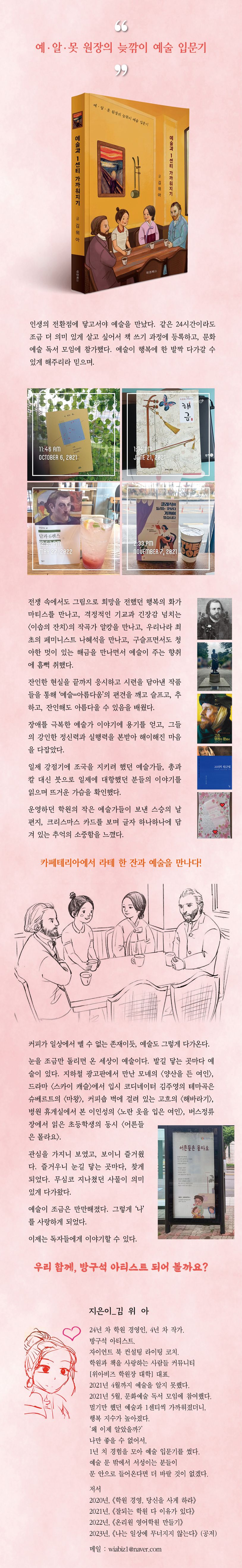 숨가쁘게 바쁜 일상을 살아가느라 모르고 살다가 인생의 전환점에 닿고서야 예술을 만났다. 같은 24시간이라도 조금 더 의미 있게 살고 싶어서 책 쓰기 과정에 등록하고, 문화예술 독서 모임에 참가했다. 예술이 행복에 한 발짝 다가갈 수 있게 해주리라 믿으며.