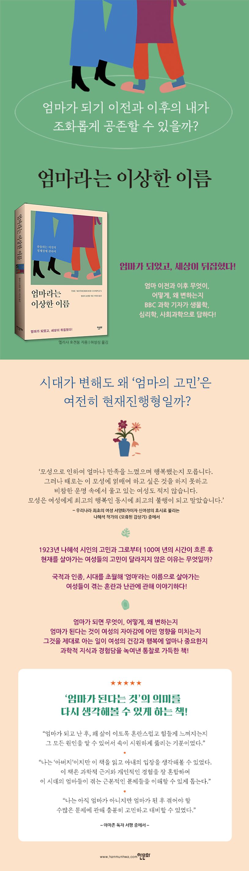 배변 훈련, 수면 훈련, 육아의 기술 등 아기를 위해 날마다 해야 하는 여러 가지 결정에 관한 관심은 뜨거워도 ‘여성’이 ‘엄마’가 되면서 경험하는 온갖 극적인 변화와 이런 변화를 어떻게 고찰하고 대처해야 하는지에 대한 관심은 좀처럼 찾아보기 힘들다. 이 책에서는 그동안 당연하게 생각해왔던 사회구조적 모순, 여성의 신체적·정신적 변화에 대한 편견과 고정관념, 남성중심적 문화로 인한 불평등, 직장으로 복귀하면서 겪는 차별, 육아 분담 문제 등 엄마의 삶 곳곳에 존재하는 난관들을 객관적이고 날카로운 시선으로 분석한다. 또한 엄마라는 새로운 정체성과 그것이 여성들에게 어떤 의미인지에 관한 과학적 연구 결과와 저자의 내적인 경험을 결합한 통찰을 보여주며 모성이 인간관계와 사회적 자아에 미치는 영향까지 폭넓게 담고 있다. 이를 통해 여성들의 삶, 더 나아가서는 사회가 좀 더 나은 방향으로 나아가기 위한 방법을 찾아간다.