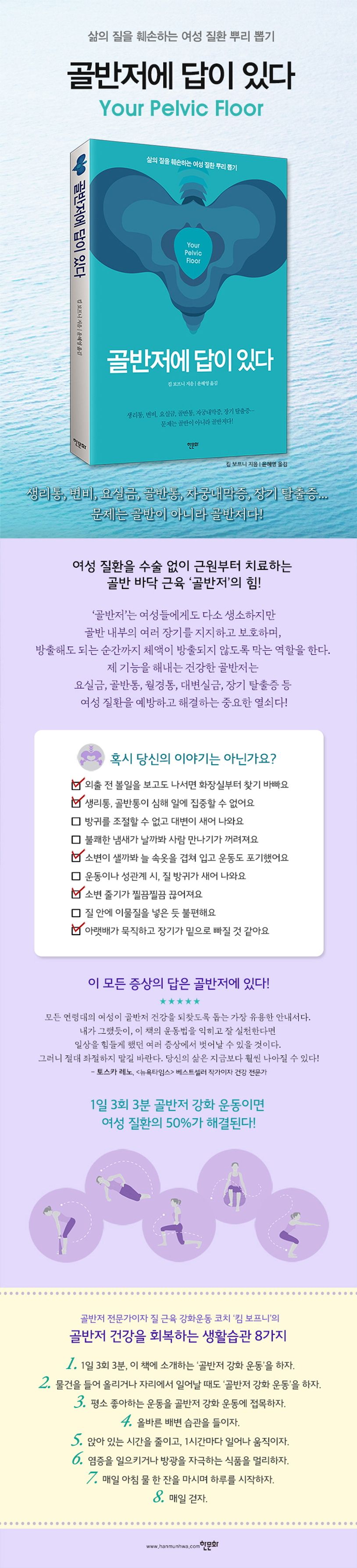 《골반저에 답이 있다》는 영국의 ‘질 근육 강화 운동 코치(Vagina Coach)’이자, 골반저 기능 회복 운동을 연구하는 전문가인 저자 킴 보프니가 대부분의 여성 질환을 치료하는 해답이 ‘골반저’에 있음을 알리고, 골반저를 건강하게 유지하고 원래의 기능을 회복하는 방법을 소개하는 책이다. 이 책을 통해 왜 골반저가 여성 건강의 핵심인지, 골반저의 기능을 방해하는 위험 요인은 무엇인지 알 수 있다. 또한 골반저 건강을 지킬 수 있는 생활 속의 다양한 운동법도 배울 수 있다.