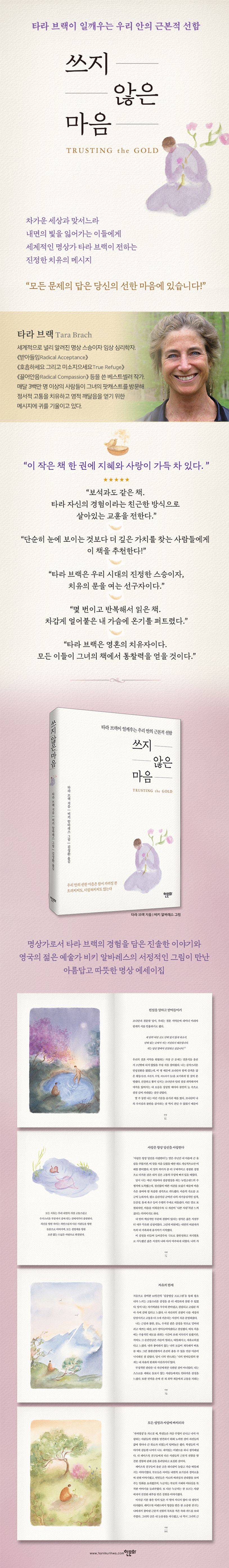《쓰지 않은 마음》은 우리 시대 가장 저명한 명상가 중 한 명이자, 다수의 베스트셀러를 집필한 작가 ‘타라 브랙’이 전하는 진정한 치유의 메시지를 담은 책이다. 저자는 우리가 살면서 겪는 모든 고통과 슬픔, 혐오와 의심을 넘어 존재의 의미를 깨닫고 자유에 이를 수 있도록 돕는 가치로, ‘근본적 선함(Natural Goodness)’을 말한다. 우리가 자신을 얼마나 부족하게 여기든, 우리가 속한 사회가 얼마나 많은 폭력과 불평등에 사로잡혀 있든 ‘근본적 선함’이 인간의 핵심이라는 사실은 변함이 없으며, 다만 이런 선한 마음을 여러 가지 이유로 그동안 쓰지 않았을 뿐이라는 것이다.