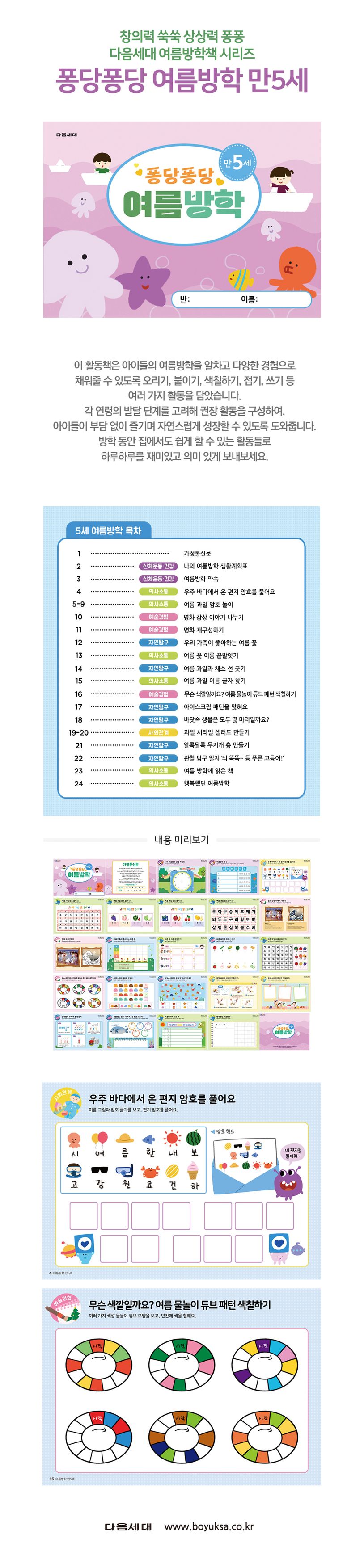 이 활동책은 아이들의 여름방학을 알차고 다양한 경험으로 채워줄 수 있도록 오리기, 붙이기, 색칠하기, 접기, 쓰기 등 여러 가지 활동을 담았습니다.