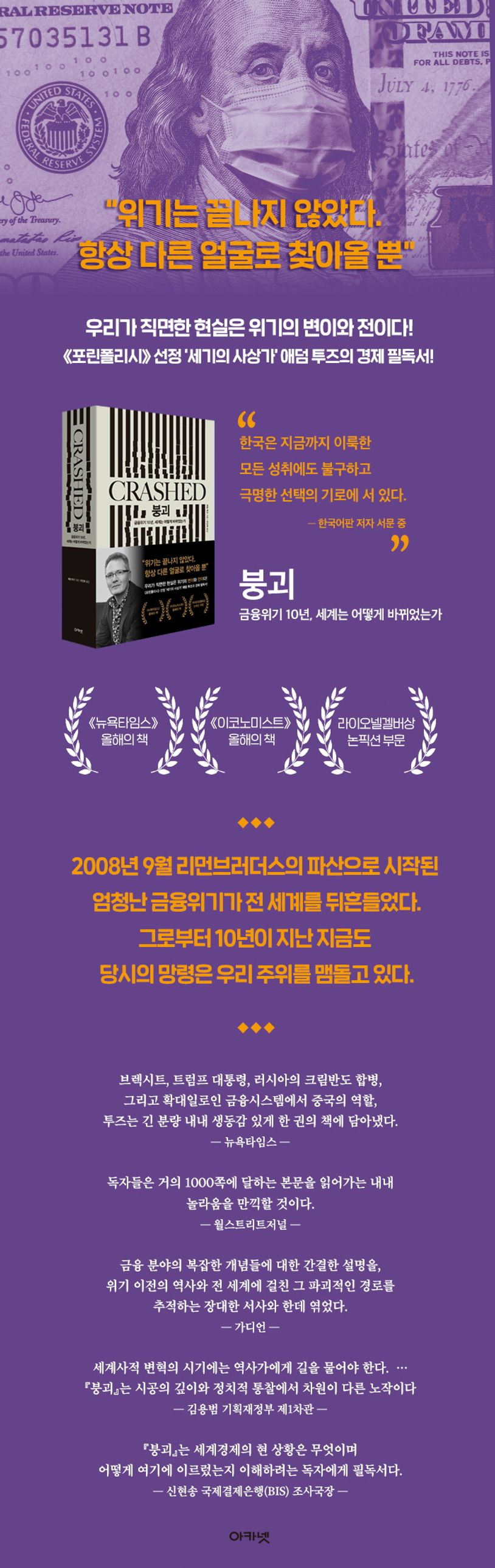 현대 자본주의 체제와 글로벌 경제의 한복판에서 벌어진 2008년 금융위기 이후 10년 역사를 다루는 『붕괴(Crashed)』. 경제사 분야에서 세계적으로 주목받는 학자인 컬럼비아대학교 애덤 투즈 교수가 위기의 진앙인 미국과 유럽은 물론 중국과 러시아, 신흥시장국가에 이르기까지 전 지구적 규모로 확산하는 금융위기의 진행 상황을 치밀하게 그려내는 한편, 위기 대응의 과정과 방법도 꼼꼼하게 진단함으로써 세계의 경제와 정치가 긴밀히 얽힌 오늘의 세계를 분명히 알려준다.