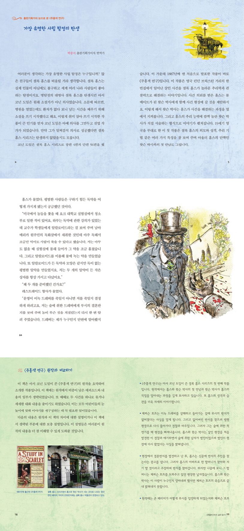 꼭 읽어야 하는 세계문학작품을 어린이의 눈높이에 맞추어 재구성한 「지성과 감성이 자라는 어린이 세계문학고전」 제19권 『주홍색 연구』. 이 책은 원작을 쉽게 재구성하여 쓴 글, 장면의 느낌을 살린 그림, 출판기획가이자 번역가가 쓴 추천의 글, 작품 해설과 작가 아서 코넌 도일을 소개한 ‘《주홍색 연구》깊이 읽기’, 책을 다 읽은 후 직접 해 볼 수 있는 ‘신 나는 독후활동’을 담았다.