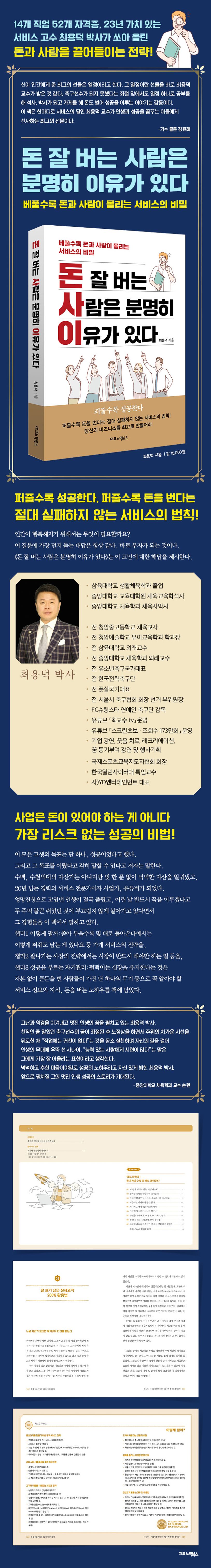 이 모든 고생의 목표는 단 하나, 성공이었다. 그리고 그 목표를 이뤘다고 감히 말할 수 있다고 말한다. 수백, 수천억대의 자산가는 아니지만 빚 한 푼 없이 넉넉한 자산을 일궈냈고, 20년 넘는 경력의 서비스 전문가이자 사업가, 유튜버가 되었다. 엉망진창으로 꼬였던 인생이 결국 풀렸고, 어린 날 반드시 꿈을 이루겠다고 두 주먹 불끈 쥐었던 것이 부끄럽지 않게 살아가고 있다면서 그 경험들을 말하고 있다. 챕터1에서는 어떻게 팔까라는 가게 서비스의 전략, 챕터2에서는 잘나가는 사장의 전략, 챕터3에서는 성공을 부르는 자기관리로 꼭 알아야 할 가게 서비스 정보와 지식, 돈을 버는 노하우를 책에 담았다.