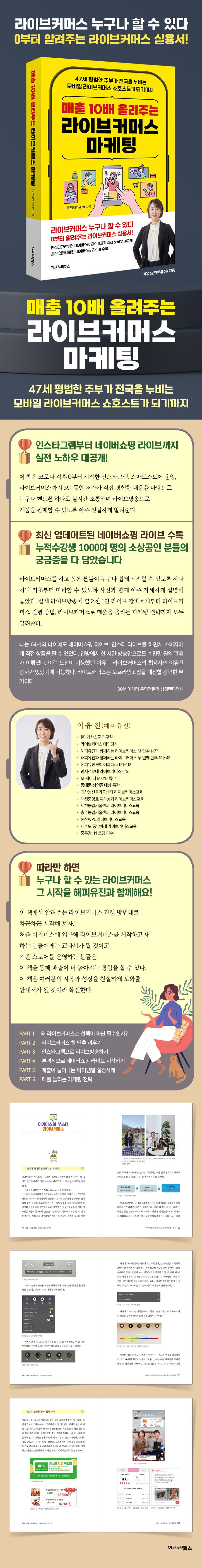 이 책은 코로나 직후 0부터 시작한 인스타그램, 스마트스토어 운영, 라이브커머스까지 3년 동안 저자가 직접 경험한 내용을 바탕으로 누구나 핸드폰 하나로 실시간 소통하며 라이브방송으로 제품을 판매할 수 있도록 아주 친절하게 알려준다. 또한 1000여 명의 소상공인들과 농업인들에게 강의를 하며 얻은 실전 노하우와 수강생들의 라이브커머스 성공사례까지 소개하고 있다.