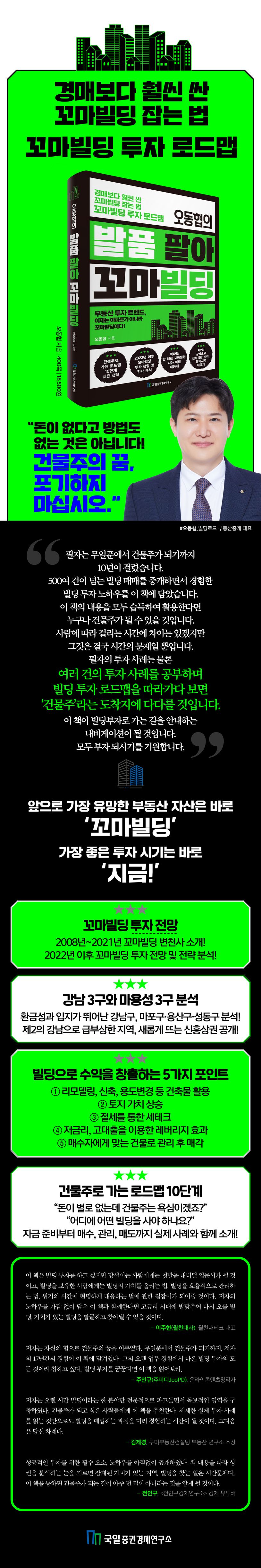코로나19와 경제 불황이 맞물려 상가 임대수익률이 하락하거나 정체된 상황이기 때문에 토지 가격 상승에 따른 시세차익을 중요시하는 것이 요즘 투자의 트렌드로 자리 잡았다. 다주택자에 대한 금융규제, 주식시장과 코인의 하락세, 인플레이션으로 인한 현금 가치 하락으로 기존의 부동산 보유가 답인 것이다. 그중에서도 가장 유망한 부동산 자산은 바로 꼬마빌딩이다. 저자는 부동산 시장에서 17년 동안 빌딩만 바라보면서 ‘안전성과 수익률 측면에서 꼬마빌딩이 매우 매력적인 재테크 상품’임을 느꼈다. 왜 꼬마빌딩의 인기가 식을 줄 모르는 것인지, 앞으로도 그럴 것인지를 최근 10여 년 사이의 빌딩 시장의 흐름을 전문가의 시선으로 분석했다. 저자는 과거를 아는 사람만이 현재를 분석해서 미래를 예측할 수 있고 준비할 수 있다고 이야기한다.