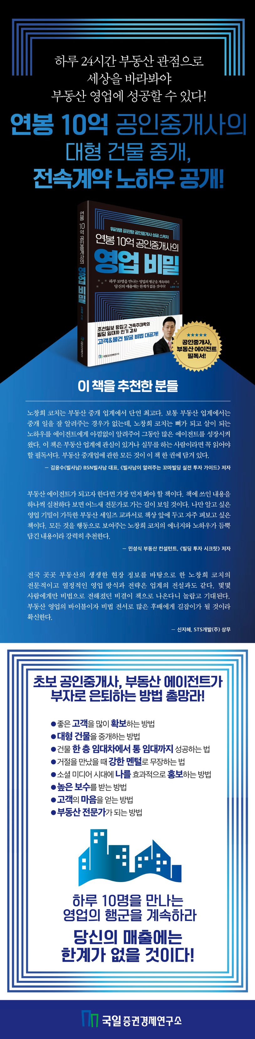 저자는 20대에 부동산 영업을 시작하여 30년 가까운 기간에 걸쳐 건물 임대차 컨설팅 영업과 사내 교육을 병행하였다. 평생 부동산 영업 에이전트이자 세일즈 코치로 살며 다양한 영업 매뉴얼을 학습하고 실행하며 실전에서 얻은 결과를 바탕으로 매뉴얼을 수정하는 과정을 무수히 반복하였다. 이 과정 속에서 부동산 영업에서 성공한 사람에게는 공통점이 있다는 것을 알게 되었다. 바로 이것이 저자가 이 책을 쓴 이유다.