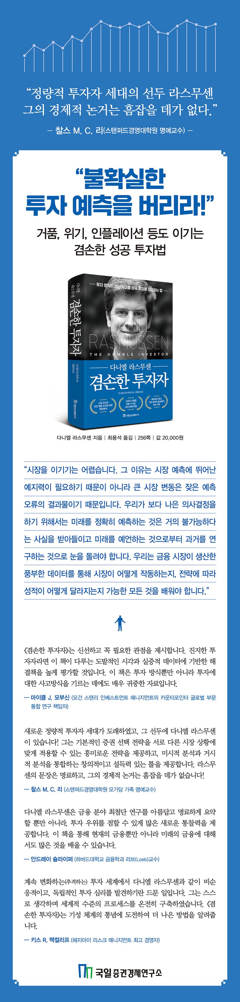 제1부에서는예측에대한최신연구,그리고예측에대한우리의미숙함을투자에적용한다.현대금융이론,즉배당할인모형,자본자산가격모형,효율적시장가설을알아보고,이들이왜그렇게자주금융시장변동성을설명하는데실패하는지를살펴본다.