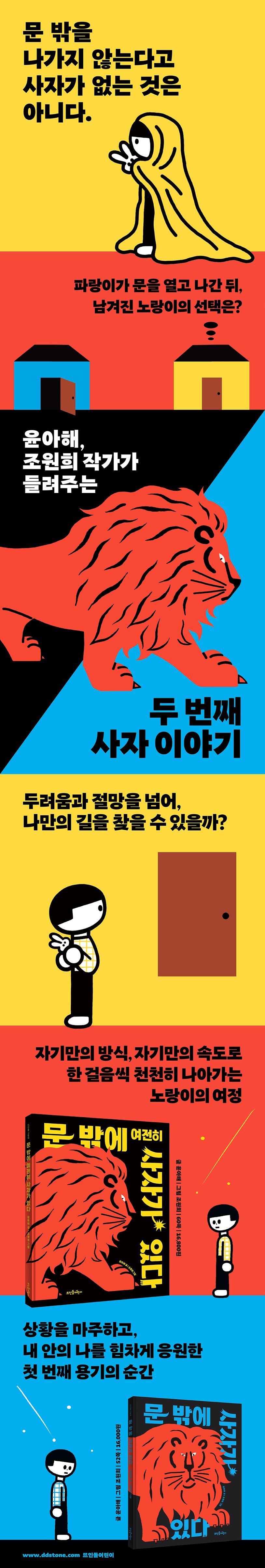 이번 책은 집 안에서 덜덜 떨고 있는 ‘노랑이’로 이야기가 시작됩니다. 파랑이가 문 밖으로 나가고 나서 홀로 남겨진 노랑이는 어떤 선택을 할까요? 파랑이처럼 사자를 유인해 밖으로 나갈까요? 아니면 여전히 집 안에 머물며 불평과 불만만을 늘어놓을까요? 노랑이의 선택이 궁금하다면, 지금 바로 이 책을 펼쳐 보세요.