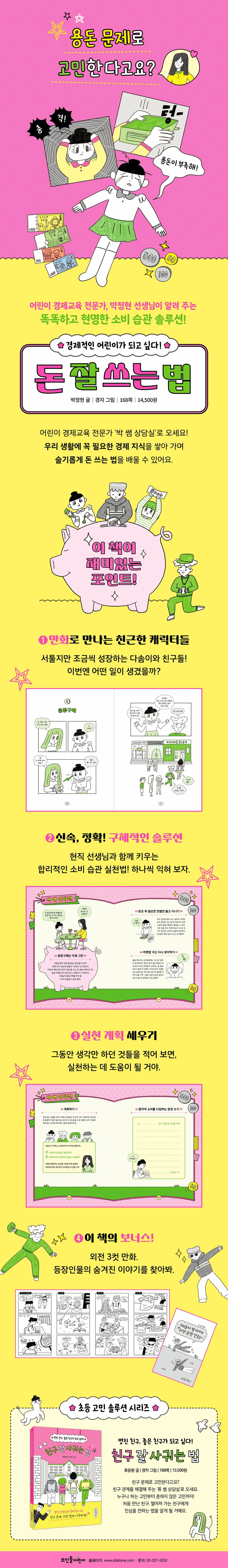 웹툰같이 재밌는 이야기와 현직 선생님이 쉽게 풀어 주는 용돈 솔루션이 들어 있는《돈 잘 쓰는 법》으로 똑똑한 소비 습관을 키워 보는 건 어떨까요? 우리 생활에 꼭 필요한 경제 지식을 차곡차곡 쌓아 가며, 합리적인 소비를 슬기롭게 실천하는 어린이가 되어 보세요.