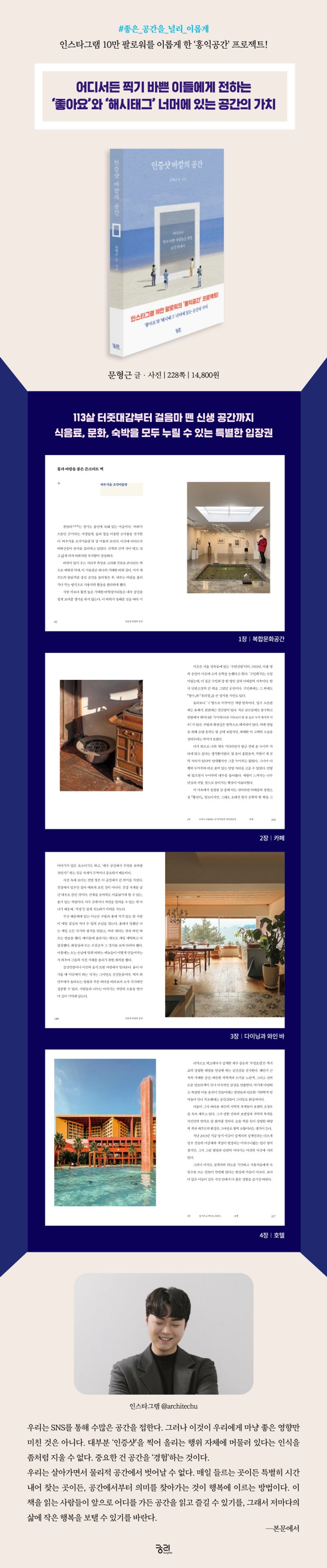 이 책은 10만 명이 넘는 팔로워를 보유한 인스타그램 인플루언서, 문형근의 첫 책이다. 한양대학교 에리카 캠퍼스에서 건축학을 전공하고 건축디자이너로 지내는 그는 2016년부터 자신의 인스타그램에 ‘#좋은_공간을_널리_이롭게’라는 해시태그와 함께 수천 곳의 공간을 소개하고 있다. 난해하고 어려운 건축 언어 대신 모두가 쉽게 이해하고 공감할 수 있는 표현으로 7년 가까이 기록해온 공간의 가치를 이 책에 한데 담았다.
