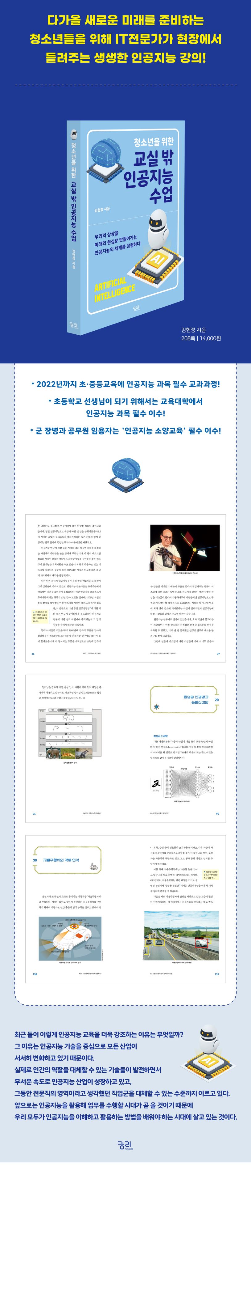 그동안 『코딩책과 함께 보는 코딩 개념 사전』 『코딩책과 함께 보는 소프트웨어 개념 사전』 『엔트리 블록코딩 100제』 등을 펴내며, IT 지식이 이제 우리에게 ‘교양’임을 이야기하고 풍성한 정보를 제공해온 IT 전문가 김현정 작가가 『청소년을 위한 교실 밖 인공지능 수업』을 새롭게 펴냈다.