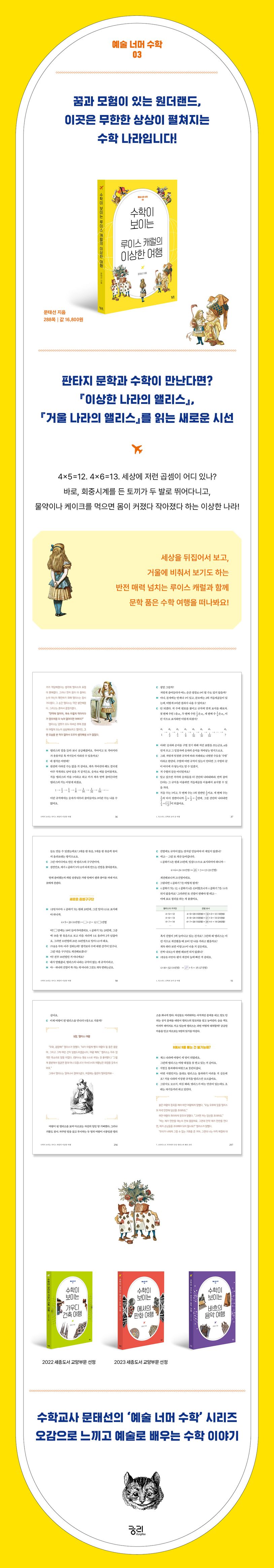 많은 사람들이 『이상한 나라의 앨리스』를 재미있고 환상적인 동화책으로 생각하지만, 사실 이 책은 세상에 대한 풍자와 수학적 논리로 가득 찬 ‘현실 풍자 수학 판타지’다. 과연 『이상한 나라의 앨리스』와 후속편인 『거울 나라의 앨리스』에는 어떤 수학 이야기가 숨어 있을까? 루이스 캐럴이 책 속에 숨겨놓은 수학적 메시지를 숨은 그림 찾기 하듯 하나씩 찾아가는 여행을 떠나보자.