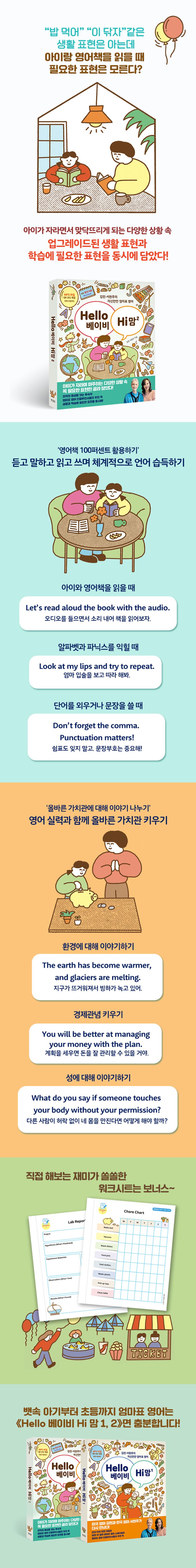 《Hello 베이비 Hi 맘 1》이 만 0~5세 아이에게 건네기 좋은 엄마의 말을 담았다면, 2편은 만 5~10세 아이와 다양한 주제로 이야기 나누기 좋은 대화문들로 가득 채웠다. 생활과 학습에 필요한 표현을 동시에 다루고 있어 아이와 소통하는 매 순간 든든한 지원군이 되어줄 것이다. 다양한 상황 속에서 더 다채로운 표현으로 아이와 대화하고 싶은 부모들의 갈증을 풀어주는 책이다.